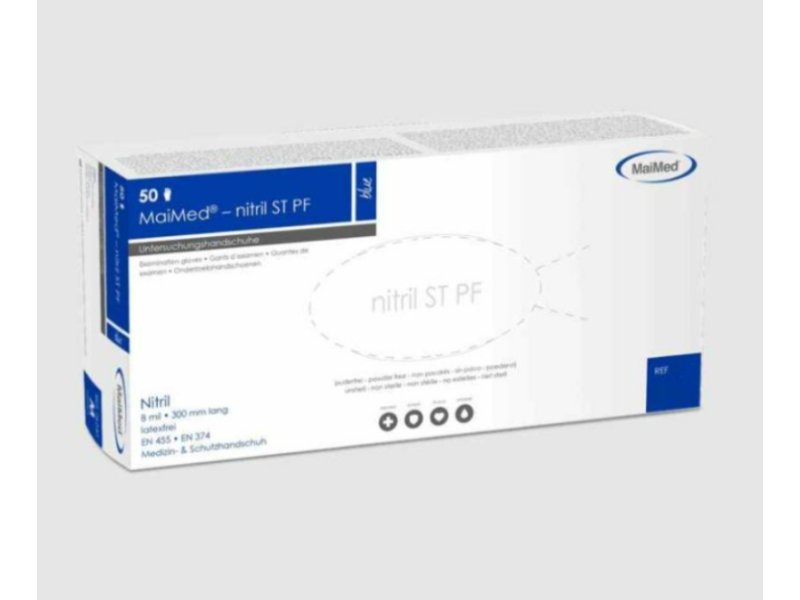De MaiMed nitril ST PF handschoenen, met een lengte van ongeveer 300 mm en een wanddikte van ongeveer 8 mil (dubbel zo dik als gewone wegwerp handschoenen) bieden een dubbele mate van bescherming en veiligheid. Vooral bij het hanteren van irriterende vloeistoffen, chemicaliën of micro-organismen beschermt ze handen en onderarmen op betrouwbare wijze. Door de sterkte van het materiaal is de handschoen uiterst scheurbestendig en duurzaam en door het microgeruwde oppervlak heeft ze een zeer goede grip, zelfs als ze nat is. De MaiMed nitril ST PF handschoenen bevatten geen latexproteïnen en is daarom zeer geschikt voor mensen met een allergie.